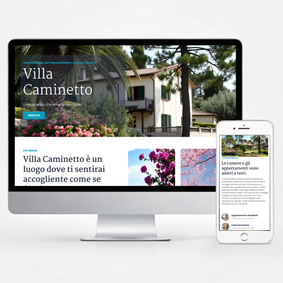 Villa Caminetto è un accogliente hotel situato nella zona di Caorle, sulla costa del Mare Adriatico. L'obiettivo del progetto era creare una presentazione visivamente accattivante e chiara dell’hotel per i turisti che pianificano una vacanza nella regione Veneto.