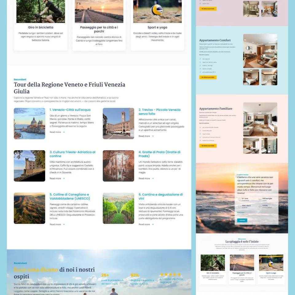 - Creazione di 14 sezioni tematiche con identità visiva personalizzata: chi siamo, camere, galleria, escursioni, vantaggi, recensioni, contatti e altro