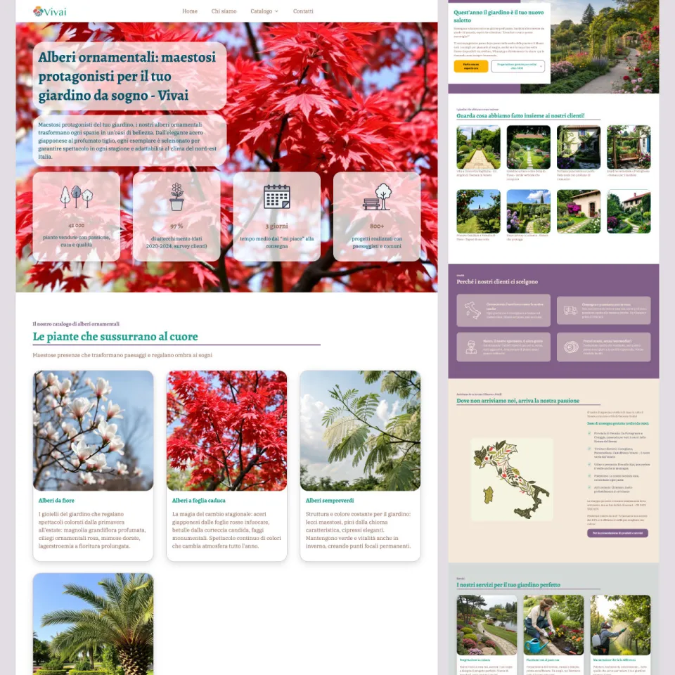 Vivai è un sito pensato per un’azienda che offre un ampio assortimento di piante e servizi di verde. L’obiettivo del progetto è fornire un catalogo chiaro, mostrare la gamma del vivaio e convertire i visitatori in richieste.